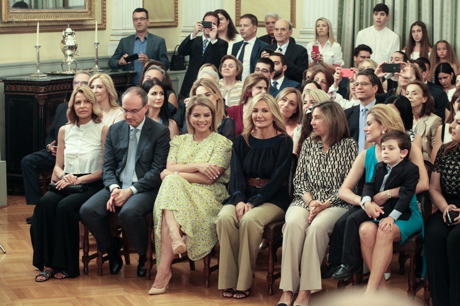 Πολλοί από τους νέους υπουργούς συνοδεύονταν από τους συγγενείς τους, που με έκδηλη χαρά παρακολούθησαν την τελετή.