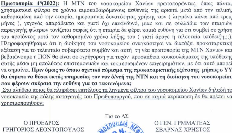 Σύμφωνα με την ανακοίνωση της Ομοσπονδίας Νεφροπαθών, η διοίκηση του νοσοκομείου Χανίων αναγκάστηκε να ξεκινήσει ΕΔΕ για τη χρήση των ληγμένων φίλτρων. Μάλιστα προειδοποιεί ότι δεν θα επιτρέψει προσπάθειες κουκουλώματος, ενώ προτρέπει έμμεσα τον υπουργό Υγείας να θέσει εκτός υπηρεσίας τη διοίκηση του νοσοκομείου Χανίων αλλά και τον διευθυντή της μονάδας Τεχνητού Νεφρού, οι οποίοι, όπως τονίζει, φέρουν ακέραια την ευθύνη.