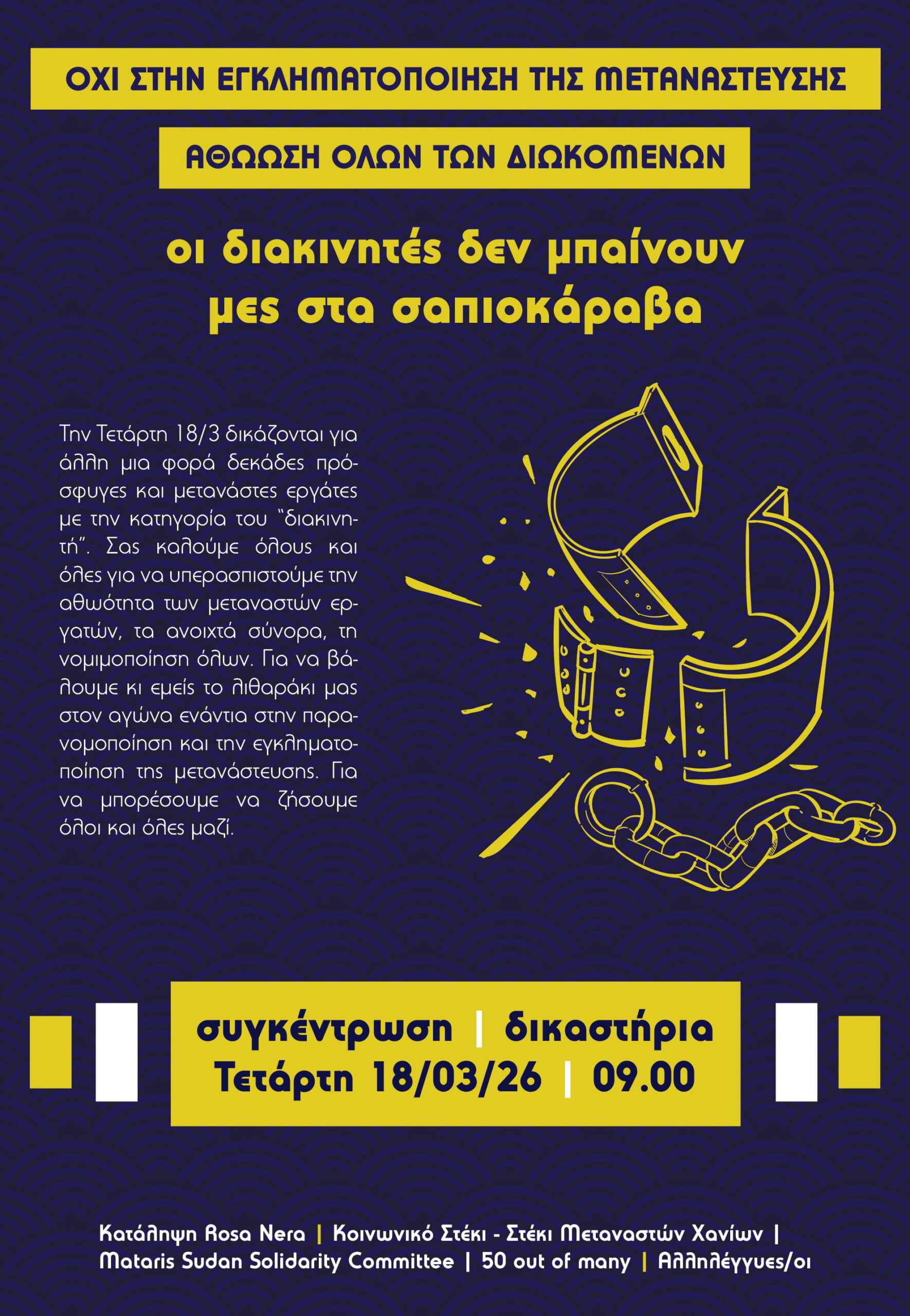 Την Τετάρτη 18/03 δικάζονται για άλλη μια φορά στα δικαστήρια Χανίων πρόσφυγες και μετανάστες με την κατηγορία του “διακινητή”.