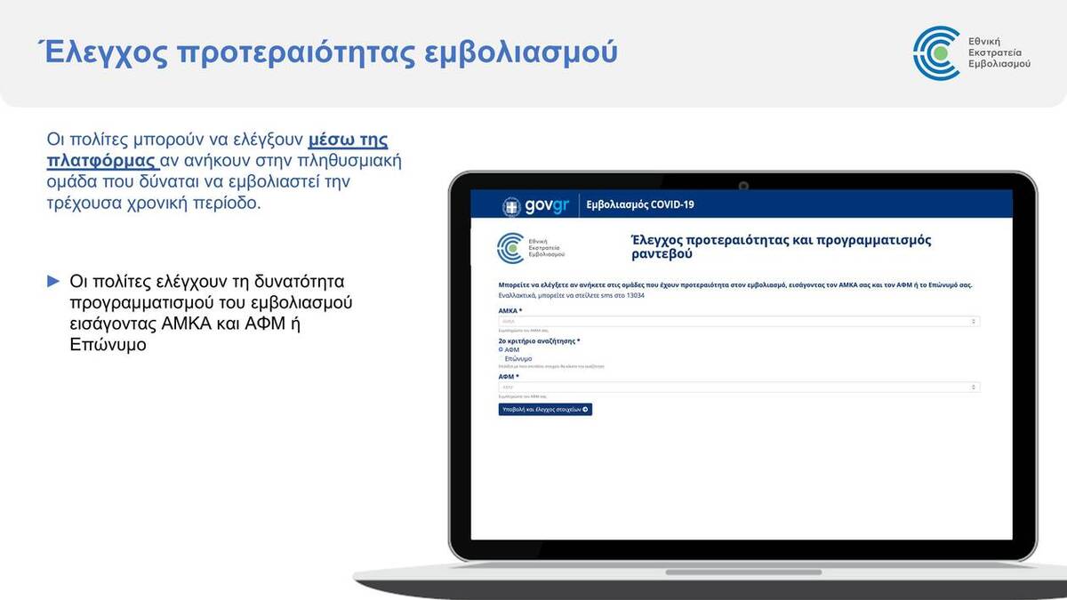 Οι πολίτες μπορούν να ελέγξουν μέσω της πλατφόρμας emvolio.gov.gr ή μέσω SMS αν ανήκουν στην πληθυσμιακή ομάδα που μπορεί να εμβολιαστεί ενάντια στον κορονοϊό την τρέχουσα χρονική περίοδο. Σημειώνεται ότι οι πολίτες μπορούν επίσης να απευθυνθούν στα πλησιέστερα ΚΕΠ ή φαρμακεία για τον έλεγχο προτεραιότητας εμβολιασμού.
