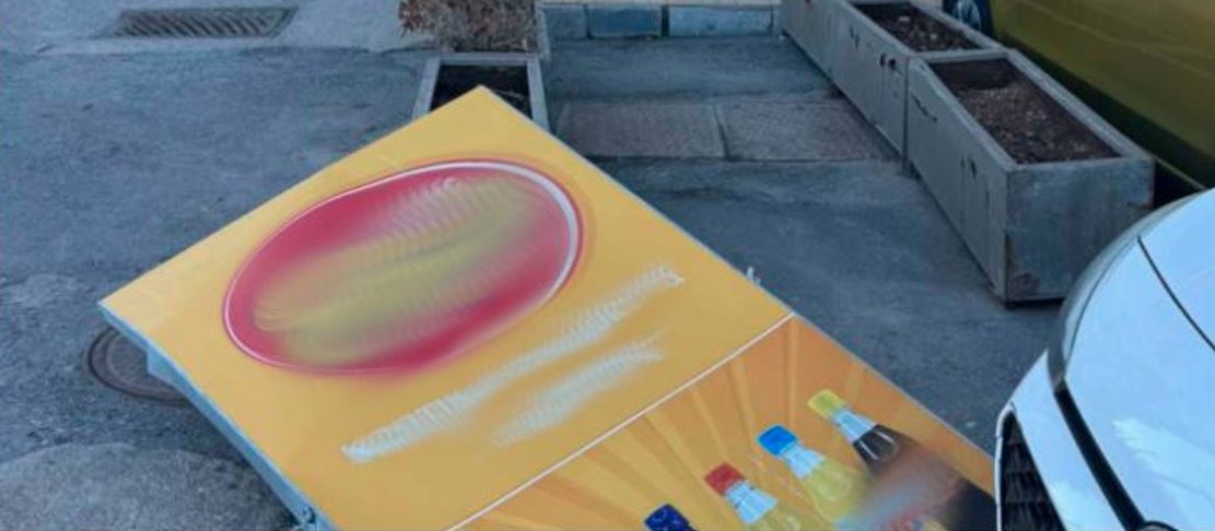 Το καπάκι λαμαρίνας προσγειώθηκε στις ζαρντινιέρες που βρίσκονται μπροστά από το κατάστημα, προκαλώντας φθορές και σε ένα σταθμευμένο αυτοκίνητο.