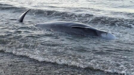 Μια νεκρή φάλαινα ξεβράστηκε από τα κύματα στην ακτή.