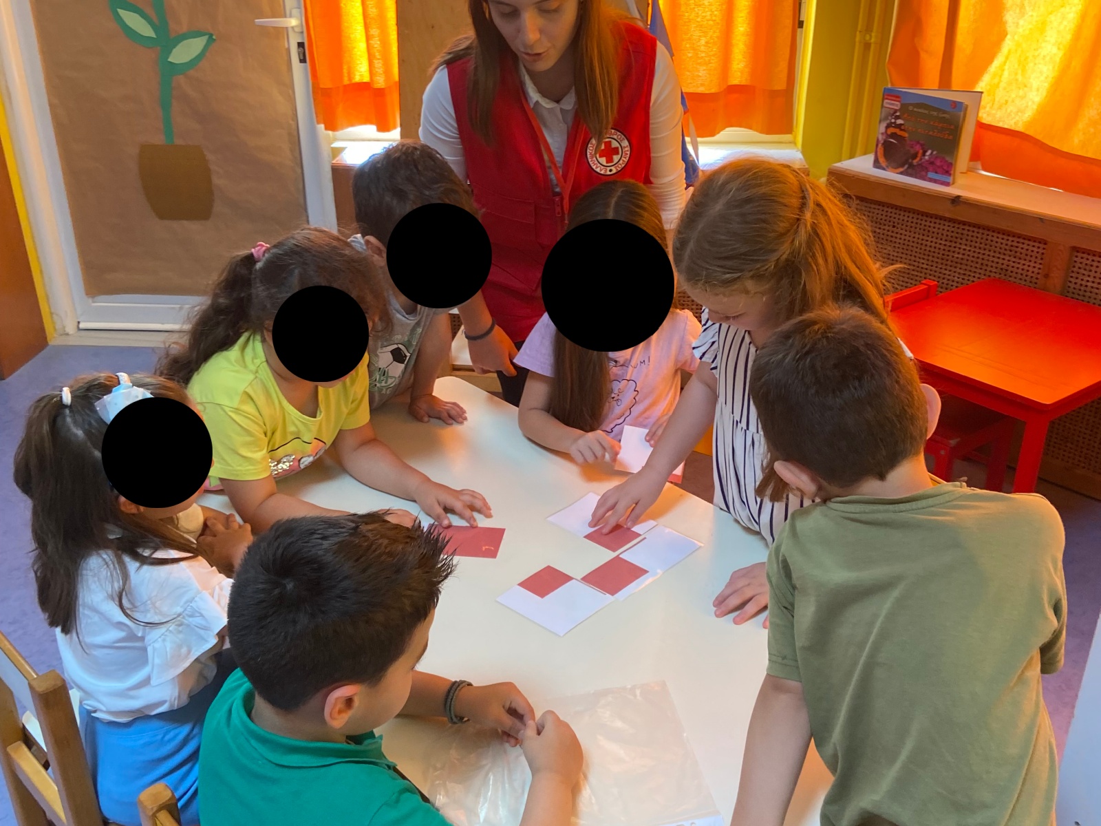 Επίσης προβλήθηκε παιδικό νideo με μηνύματα για το ρόλο του Ερυθρού Σταυρού. Οι Κοινωνικοί Λειτουργοί και ο Σαμαρείτης-Διασώστης του Ερυθρού Σταυρού Γ. Δουκιαντζάκης με κατανοητό τρόπο τους εξήγησαν τη σημαίνει Εθελοντισμός και πρώτες βοήθειες και στη συνέχεια ένωσαν κομμάτια παζλ για να σχηματίσουν τον Ερυθρό Σταυρό, και αποτύπωναν τις εντυπώσεις τους στο χαρτί ζωγραφίζοντας.
