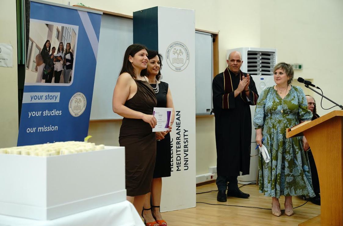 Ιδιαίτερη στιγμή στην εκδήλωση, η απονομή υποτροφίας με τη μορφή χρηματικού βραβείου της αποφοίτου με την καλύτερη επίδοση κα. Μαρία Κισσανδράκη από την κα. Μαρία Μανιαδή, ανώτατο διοικητικό στέλεχος της εταιρείας Grant Thornton στο πλαίσιο συνεργασίας της εταιρείας με το ΕΛΜΕΠΑ και τη Σχολή Επιστημών Διοίκησης και Οικονομίας.