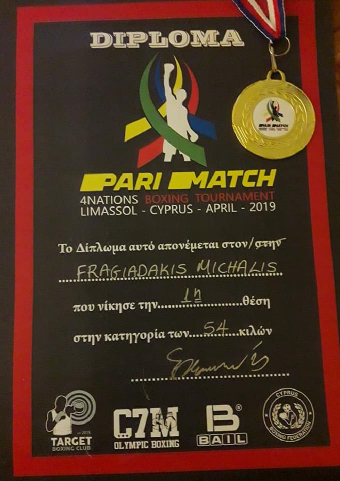 Το χρυσό μετάλλιο στο διεθνές τουρνουά πυγμαχίας της Κύπρου LIMASSOL NATIONS CUP κατέκτησε στην κατηγορία των 54 κιλών ο 16χρονος πυγμάχος από τις Ατσιπάδες Ηρακλείου, Μιχάλης Φραγκιαδάκης