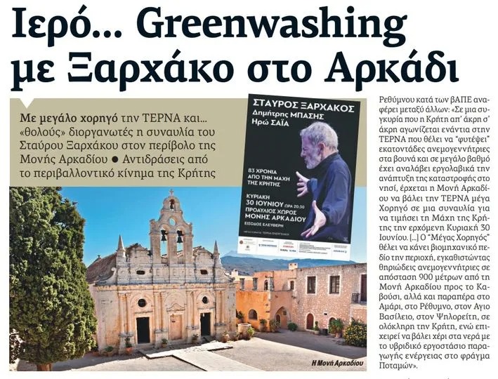 Μια μικρή αλλά σημαντική νίκη πέτυχε το Συντονιστικό Ρεθύμνου κατά των βιομηχανικών ΑΠΕ. Η πρόσφατη διαμαρτυρία του για την… πονηρή χορηγία της ΤΕΡΝΑ Ενεργειακή στη συναυλία που διοργάνωνε η Μητρόπολη Ρεθύμνης και Αυλοποτάμου στη Μονή Αρκαδίου πήρε μεγάλες διαστάσεις και οι αντιδράσεις έπιασαν τόπο.