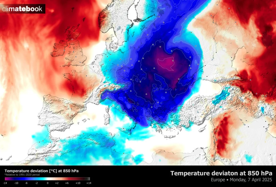 Αποκλίσεις της θερμοκρασίας στη στάθμη των 850hPa για την περιοχή της Ευρώπης τη Δευτέρα 07/04: