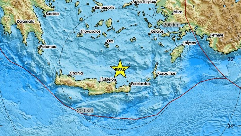 Σύμφωνα με τα πρώτα στοιχεία το επίκεντρο του σεισμού εντοπίστηκε 55 χλμ. βόρεια της Νεάπολης Λασιθίου στην Κρήτη.