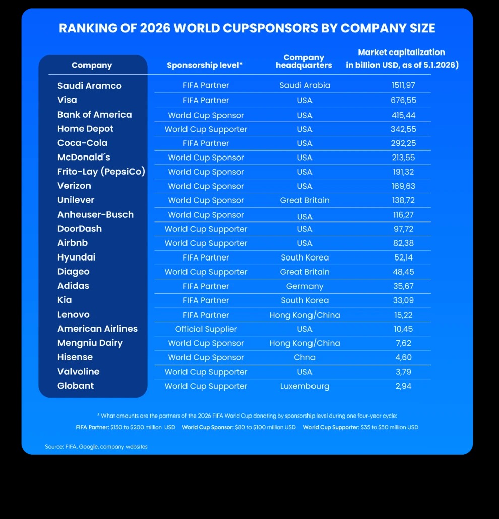 Στην κύρια κατηγορία χορηγιών, «FIFA partner», περιλαμβάνονται επτά εταιρείες, με συνεισφορές από 150 έως 200 εκατομμύρια δολάρια. Από αυτές, οι Visa και Coca-Cola είναι από τις ΗΠΑ. Η Νότια Κορέα διαθέτει επίσης δύο βασικούς παίκτες: τις Hyundai και Kia. Το χορηγικό «dream team» συμπληρώνουν η Saudi Aramco από τη Σαουδική Αραβία, η Adidas από τη Γερμανία και η Lenovo από την Κίνα.