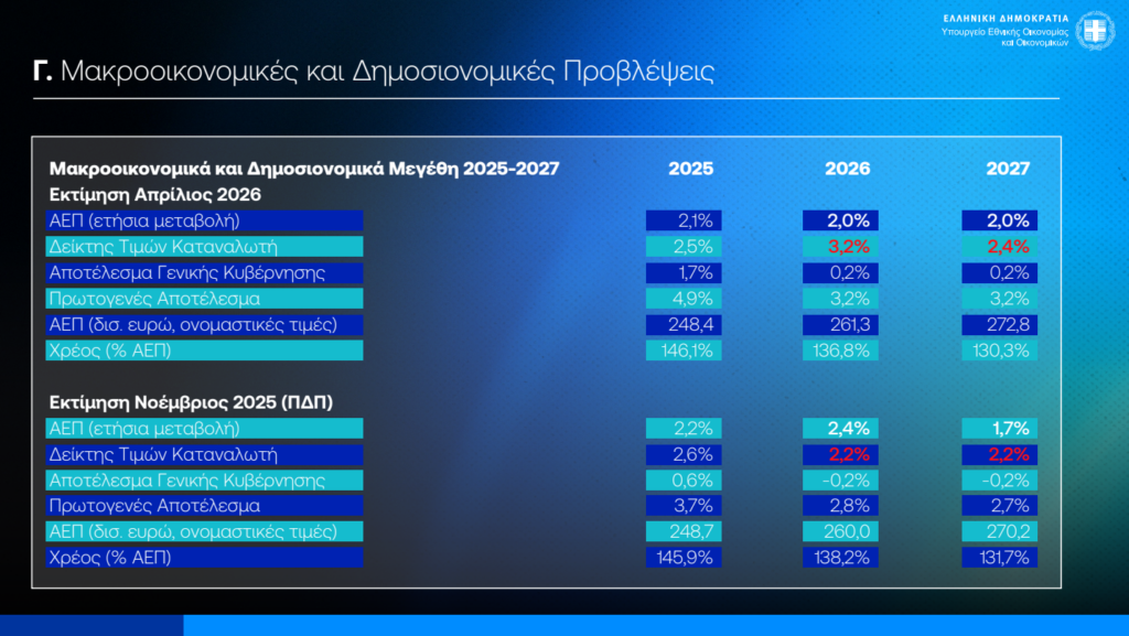 Το πρωτογενές πλεόνασμα θα είναι 3,2% του ΑΕΠ το 2026 και το 2027, χωρίς να υπάρξουν νέα μέτρα. Το ονομαστικό ΑΕΠ θα αυξηθεί στα 272,8 δισ. ευρώ το 2027 από 261,3 δισ. ευρώ εφέτος, ενώ το δημόσιο χρέος θα μειωθεί στο 130,3% του ΑΕΠ το 2027 από 136,8% του ΑΕΠ εφέτος. Ενώ, το επόμενο έτος το συγχρηματοδοτούμενο ΠΔΕ θα αυξηθεί στα 7 δισ. ευρώ από 6,35 δισ. ευρώ.