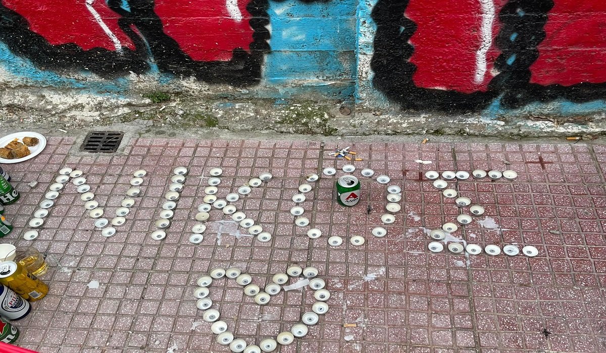 Η οδός Ασκληπιού στη Λάρισα, μπροστά από την μισογκρεμισμένη κολόνα και την σκουριασμένη μεταλλική πόρτα, είχε γεμίσει με λουλούδια, κεριά και μηνύματα με δύο λόγια για το παλικάρι που έφυγε τόσο άδικα.