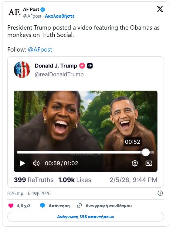 Ο Τραμπ ανέβασε προκλητικό βίντεο που εμφανίζει τους Ομπάμα ως πιθήκους – Σάλος στις ΗΠΑ
