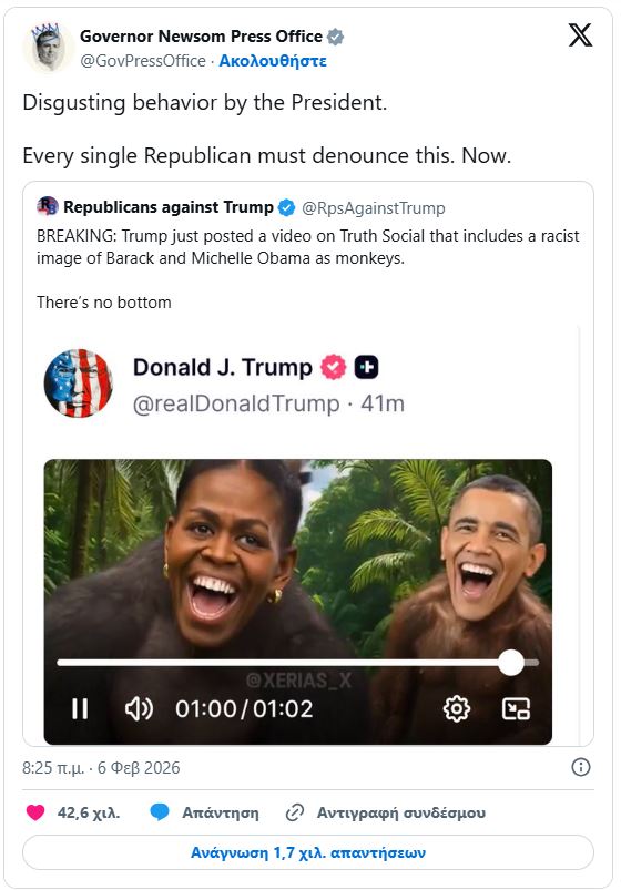 «Αηδιαστική συμπεριφορά από τον Πρόεδρο. Όλοι οι Ρεπουμπλικανοί πρέπει να το καταγγείλουν. Τώρα», έγραψε στο Χ ο λογαριασμός του Γραφείου Τύπου του κυβερνήτης Καλιφόρνια, Γκάβιν Νιούσομ.