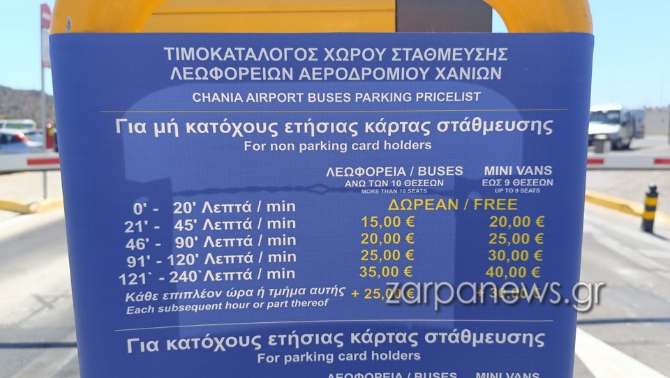 Όπως εξηγεί στο zarpanews.gr ο αντιπρόεδρος του συλλόγου τουριστικών λεωφορείων στα Χανιά, Κώστας Σταυρουλάκης, το ποσό αυτό αφορά 1:30 ώρα στάθμευσης τη φορά για όλο το χρόνο. Διαφορετικά, δίνεται… δωρεάν δυνατότητα 20 λεπτών στάθμευσης και αμέσως μετά η χρέωση είναι 15 ευρώ, όπως άλλωστε φαίνεται και στην σχετική πινακίδα που έχει τοποθετηθεί στην είσοδο του χώρου: