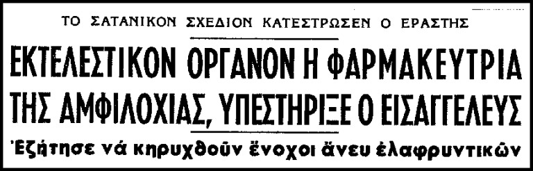 Σύμφωνα με την Μηχανή του Χρόνου, ο εισαγγελέας της έδρας ήταν καταπέλτης κατά την αγόρευσή του. Χαρακτήρισε “λύκους” και τους δύο κατηγορούμενους, θεώρησε την “φαρμακεύτρια” πειθήνιο όργανο του εραστή της και ζήτησε την παραδειγματική καταδίκη τους.