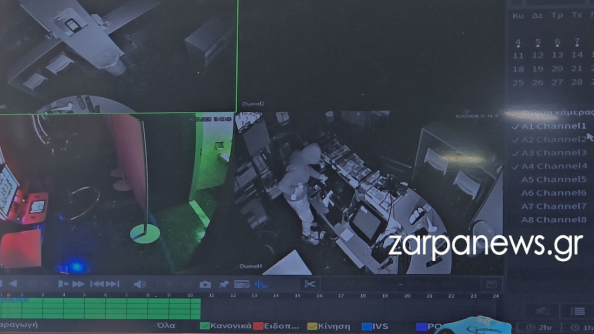 Όπως φαίνεται χαρακτηριστικά στο βίντεο από τις κάμερες ασφαλείας που εξασφάλισε το zarpanews.gr, ο διαρρήκτης, αφού εισέρχεται από το παράθυρο του μπάνιου στον πάνω όροφο – πατάρι του πρακτορείου, κατεβαίνει κάτω δια μέσου της ξύλινης σκάλας, φορώντας κουκούλα και αφού έχει τοποθετήσει μάσκα για να καλύψει τα χαρακτηριστικά του προσώπου του.