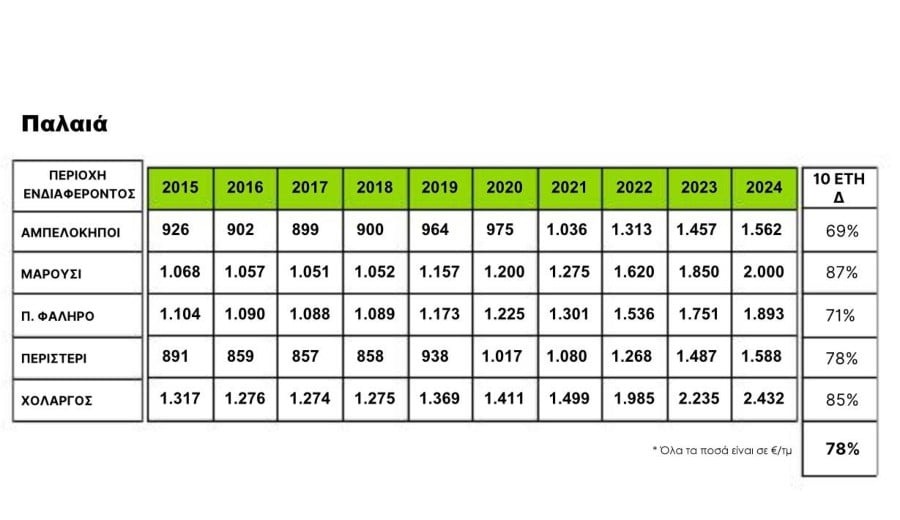 Ειδικότερα σύμφωνα με το Παρατηρητήριο της GEOAXIS, μεταξύ του 3ου τριμήνου 2023 και του 3ου τριμήνου 2024 καταγράφεται διάμεση ετήσια άνοδος 8,51% για τα νεόδμητα και 7,81% για τα παλαιότερα διαμερίσματα. Η σημαντική άνοδος των αξιών εξηγείται από το γεγονός ότι λόγω μεγάλης μείωσης της προσφοράς (ελέω εξαιρετικής τουριστικής σεζόν και Airbnb) το φετινό δείγμα περιλαμβάνει ως επί το πλείστον πολύ νεότερα και ακριβότερα διαμερίσματα. Από το διαδίκτυο, τις μικρές αγγελίες εφημερίδων και τα site μεσιτικών γραφείων έχουν επιλεγεί τυπικές κατασκευές σε τυπικές θέσεις. Διαμερίσματα με ανεμπόδιστη θέα, σε κατασκευές από διάσημους αρχιτέκτονες και με πολύ ακριβά υλικά καταγράφουν αξίες πάνω από 25% των τυπικών διαμερισμάτων.