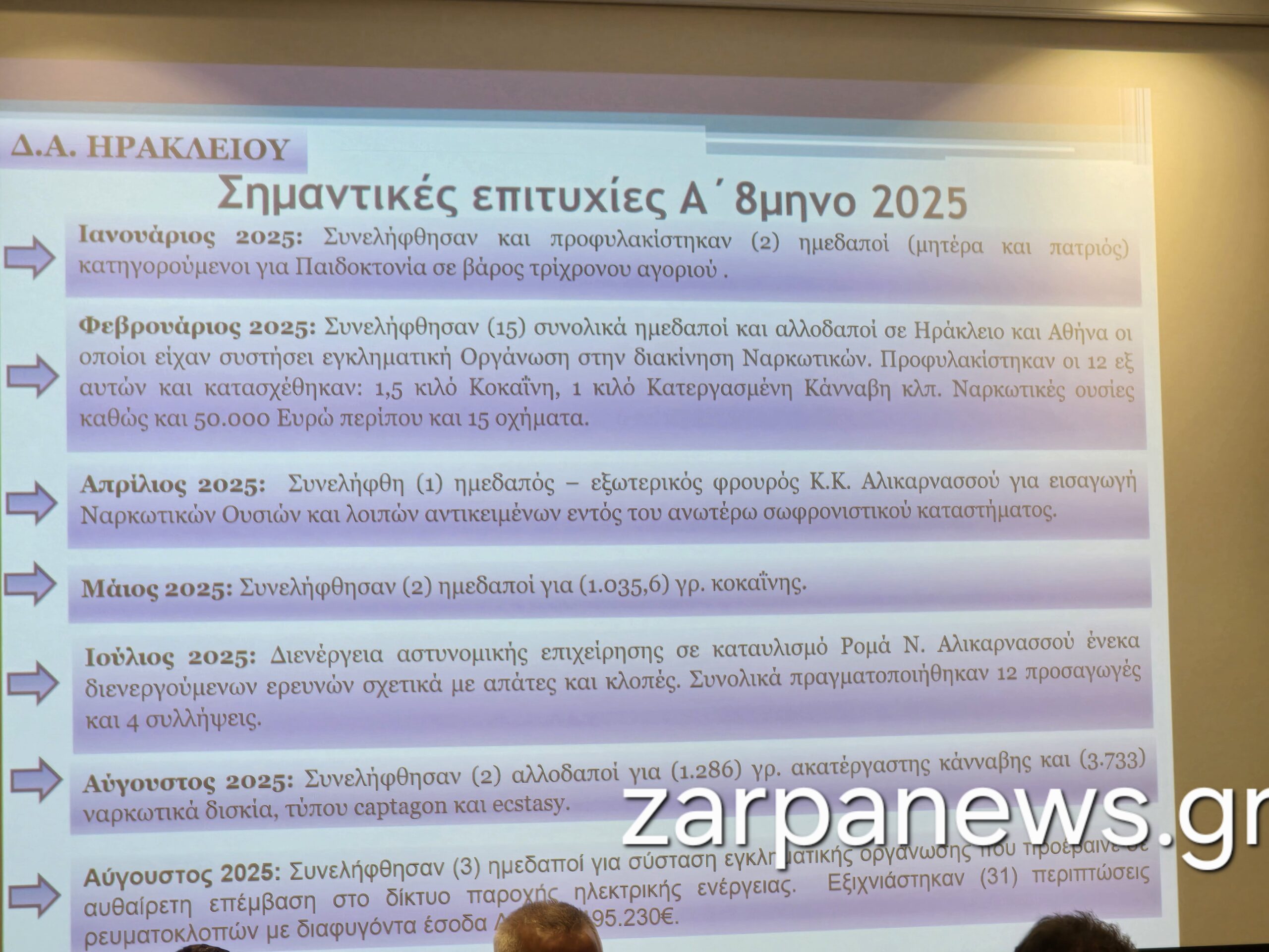 Σε επίπεδο νησιού, την παρουσίαση έκανε ο προϊστάμενος του Τμήματος Αντιμετώπισης Οργανωμένου Εγκλήματος Κρήτης (ΤΑΟΕΚ) Μανώλης Πιπεράκης δίνοντας αναλυτικά στοιχεία για τη δράση του το τελευταίο έτος, μετά την υπαγωγή του στη Διεύθυνση Αντιμετώπισης Οργανωμένου Εγκλήματος του Αρχηγείου ΕΛ.ΑΣ. το τελευταίο 12μηνο και λειτουργεί με άμεση εποπτεία εισαγγελικού λειτουργού.