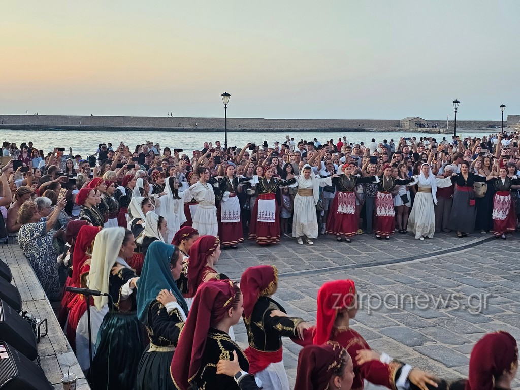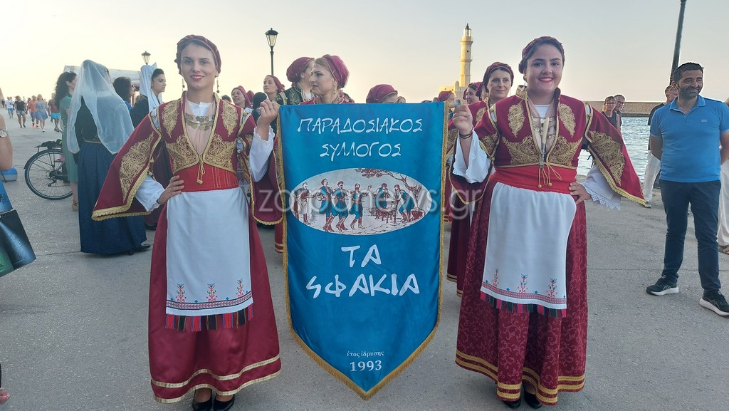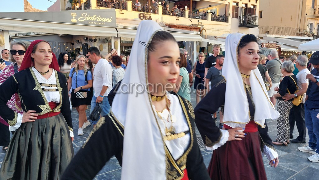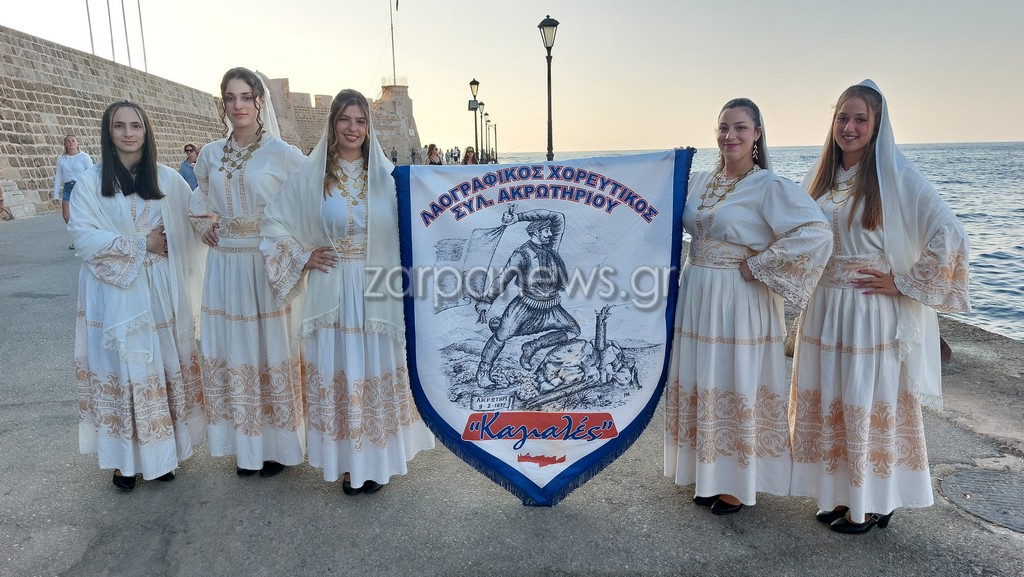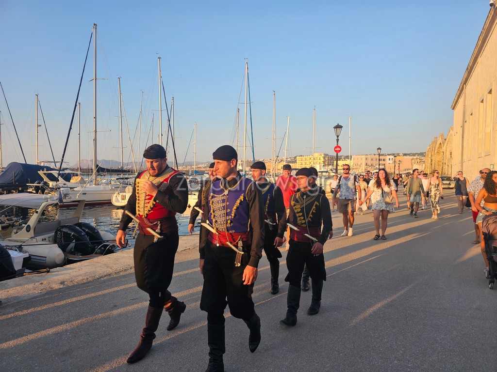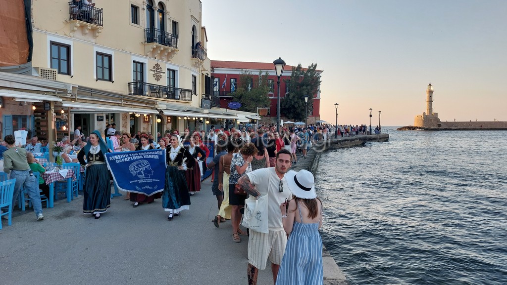 Οι Κρητικοί χορευτές βρέθηκαν στον Λιμενοβραχίονα του Ενετικού Φάρου, που προσέφεραν ένα μοναδικό χορευτικό θέαμα με φόντο το ηλιοβασίλεμα.