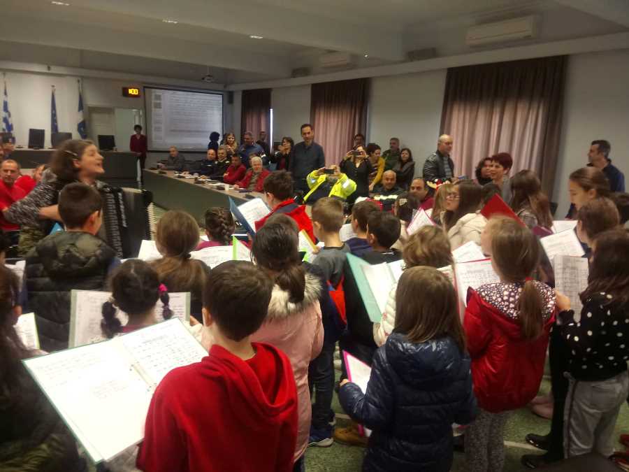 Η αίθουσα του δημοτικού συμβουλίου πλημμύρισε από τις φωνούλες των παιδιών δίνοντας χριστουγεννιάτικο τόνο στην ατμόσφαιρα.
