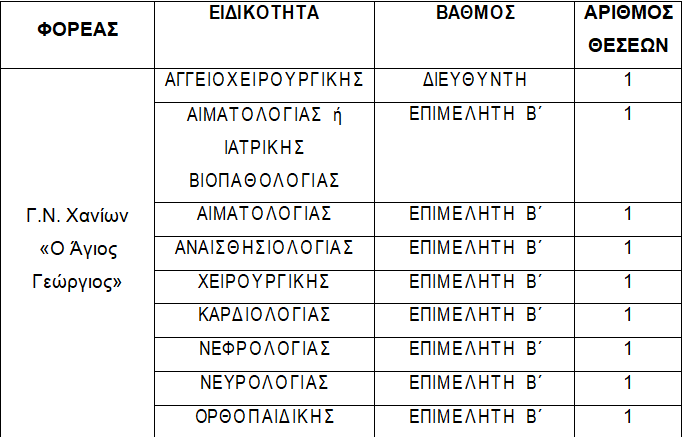 Η σχετική έγκριση της προκήρυξης των θέσεων έγινε από το Υπουργείο Υγείας στις 17 Μαΐου, ενώ οι ειδικότητες των γιατρών που προκηρύσσονται για το νοσοκομείο Χανίων είναι οι εξής: