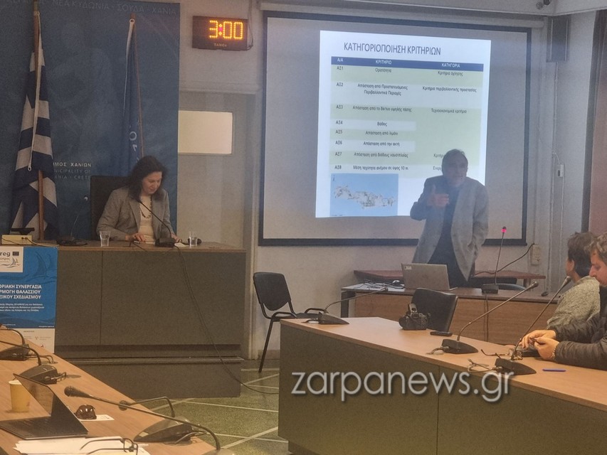 Την παρουσίαση των θέσεων, οι οποίες αποτελούν συνάρτηση πάνω από 30 περιβαλλοντικών και κοινωνικών μεταβλητών, έκανε ο καθηγητής του Πολυτεχνείου Κρήτης, Θεοχάρης Τσούτσος, σε ημερίδα για το πρόγραμμα interreg με θέμα τον θαλάσσιο χωροταξικό σχεδιασμό που φιλοξενήθηκε στο δημαρχείο την Τρίτη παρουσία του γενικού γραμματέα χωροταξικού σχεδιασμού του ΥΠΕΝ, Ευθύμιου Μπακογιάννη.