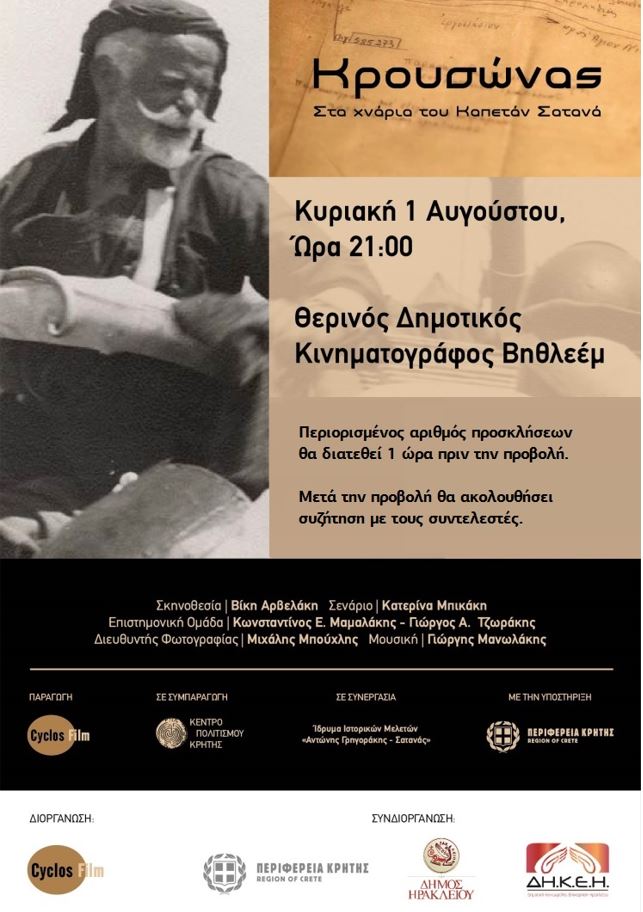 Η πρώτη δημόσια προβολή του ντοκιμαντέρ «Kρουσώνας: Στα Χνάρια του Καπετάν Σατανά» στην Κρήτη, μετά την φεστιβαλική πρεμιέρα στο 23ο Φεστιβάλ Ντοκιμαντέρ Θεσσαλονίκης, θα πραγματοποιηθεί την Κυριακή 1 Αυγούστου στις 21:00 στον Θερινό Δημοτικό Κινηματογράφο Βηθλεέμ στο Ηράκλειο.