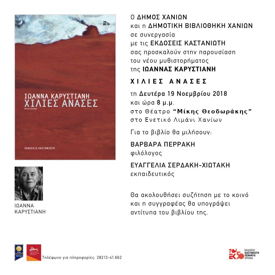 Ο Δήμος Χανίων και η Δημοτική Βιβλιοθήκη Χανίων σε συνεργασία με τις Εκδόσεις Καστανιώτη παρουσιάζουν το νέο μυθιστόρημα της Ιωάννας Καρυστιάνη “ΧΙΛΙΕΣ ΑΝΑΣΕΣ” τη Δευτέρα 19 Νοεμβρίου στις 8 μ.μ, στο Θέατρο «Μίκης Θεοδωράκης», στο Ενετικό Λιμάνι Χανίων.
