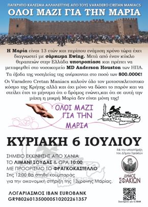 Το ραντεβού όλων μας την Κυριακή 6 Ιουλίου θα είναι στις 10:00 το πρωί στο λιμάνι της Σούδας, για τους Χανιώτες, από όπου θα αναχωρήσουμε μαζικά προς τα Ασκύφου όπου θα ενσωματωθουμε με μοτοσυκλετιστες από όλη την Κρήτη, με τελικό προορισμό μας το Φραγκοκάστελλο, όπου με την στήριξη του Δήμου Σφακίων στις 12:00 το μεσημέρι και για μια ώρα περίπου θα στηθεί κουμπαράς για την στήριξη της μικρής Μαρίας! Καλή αντάμωση!”