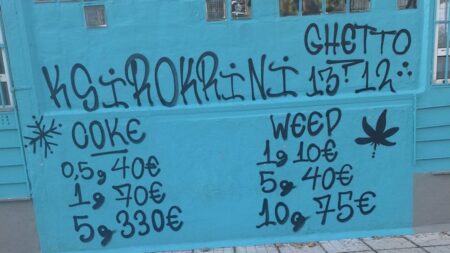 Σοκ και ανησυχία έχει προκαλέσει στην περιοχή της Ξηροκρήνης στη Θεσσαλονίκη η εμφάνιση γκράφιτι με τιμές κοκαΐνης και ινδικής κάνναβης ανά γραμμάριο στον αύλειο χώρο του Πρότυπου Εκκλησιαστικού Γυμνασίου και Λυκείου Νεάπολης με τον καλλιτέχνη που το έφτιαξε να υπογράφει ως «ghetto ksirokrini».