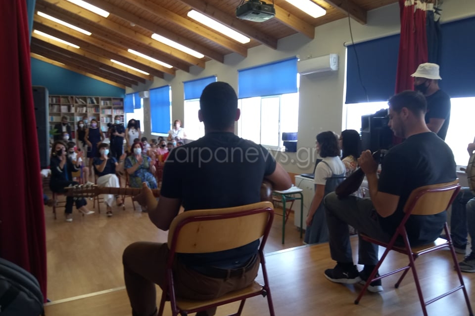 Στη συνέχεια η κα Αγγελοπούλου Δασκαλάκη επισκέφθηκε το Μουσικό Σχολείο. Εκεί ήταν μέλη του Χορευτικού Συγκροτήματος “Ο Ψηλορείτης” του Κώστα Μπούτζουκα που την υποδέχτηκαν με παραδοσιακές στολές αλλά και παιδιά του σχολείου που έπαιξαν κρητική μουσική και τραγούδια