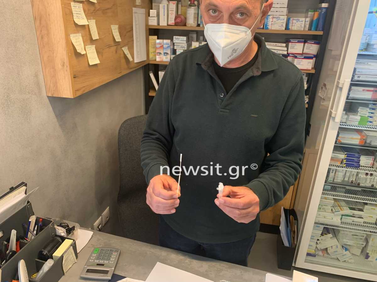 «Για το τεστ απαιτούνται τέσσερα συστατικά», λέει αρχικά και συνεχίζει: «Είναι η κασέτα που θα μας δείξει το αποτέλεσμα, η μπατονέτα που παίρνουμε το επίχρισμα το ρινικό, ένας δοκιμαστικός σωλήνας που θα χρησιμοποιήσουμε για να βάλουμε το επίχρισμα και ο διαλύτης».