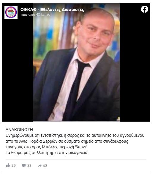 «Ενημερώνουμε οτι εντοπίστηκε η σορός και το αυτοκίνητο του αγνοούμενου απο τα Άνω Πορόϊα Σερρών σε δύσβατο σημείο απο συνάδελφους κυνηγούς στο όρος Μπέλλες περιοχή “Χωνι”.