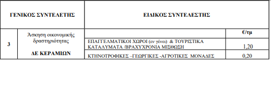 3. Επιφάνειες με φωτοβολταικά ορίζουμε τέλος 0,10 € /τ.μ επί της επιφάνειας κάλυψης των πάνελ φωτοβολταικών. Σε μη στεγασμένους χώρους με αγροτικές καλλιέργειες δεν επιβάλλονται τέλη