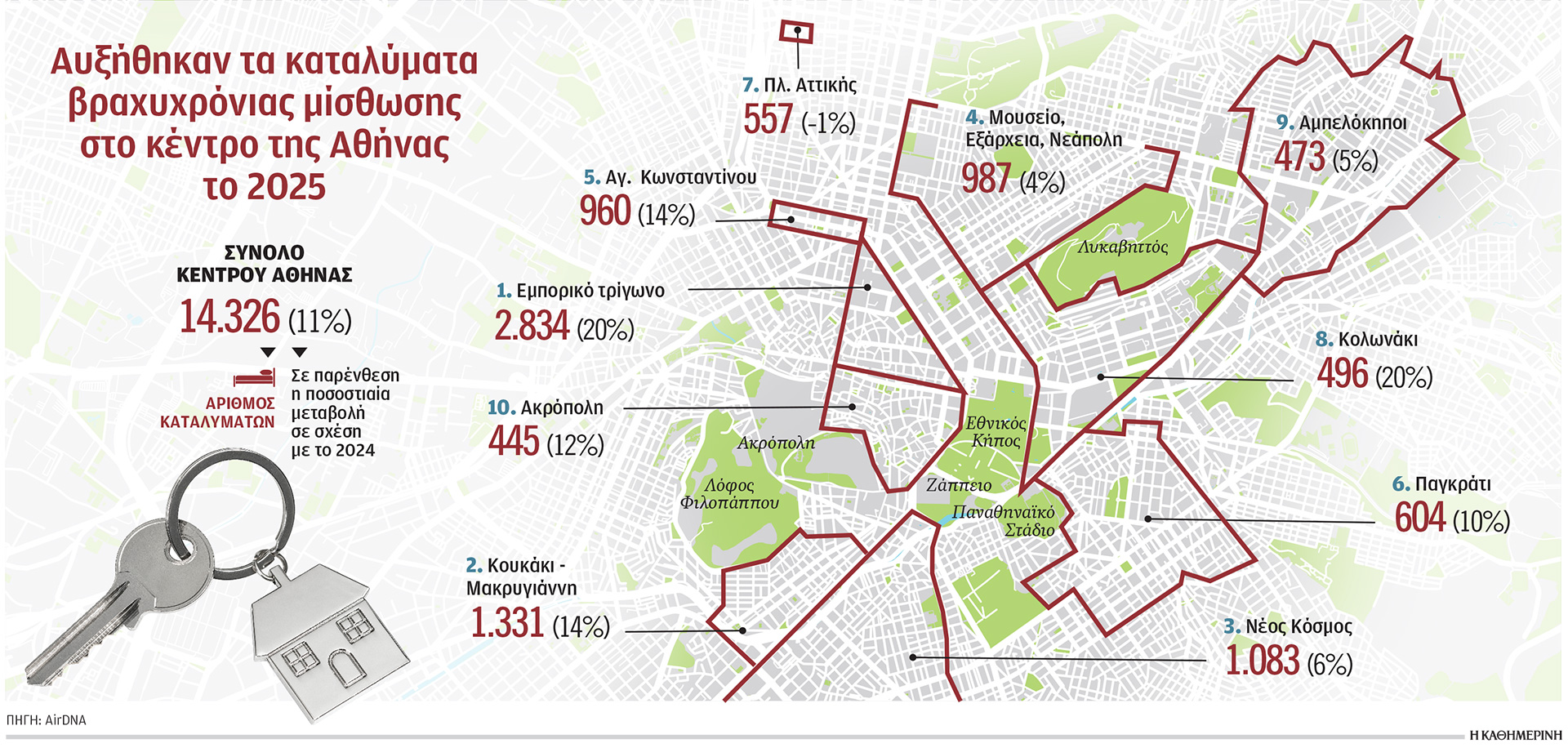 Στις γειτονιές του κέντρου ο αριθμός τους το 2025 είναι υψηλότερος κατά 1.440 καταλύματα έναντι του 2024