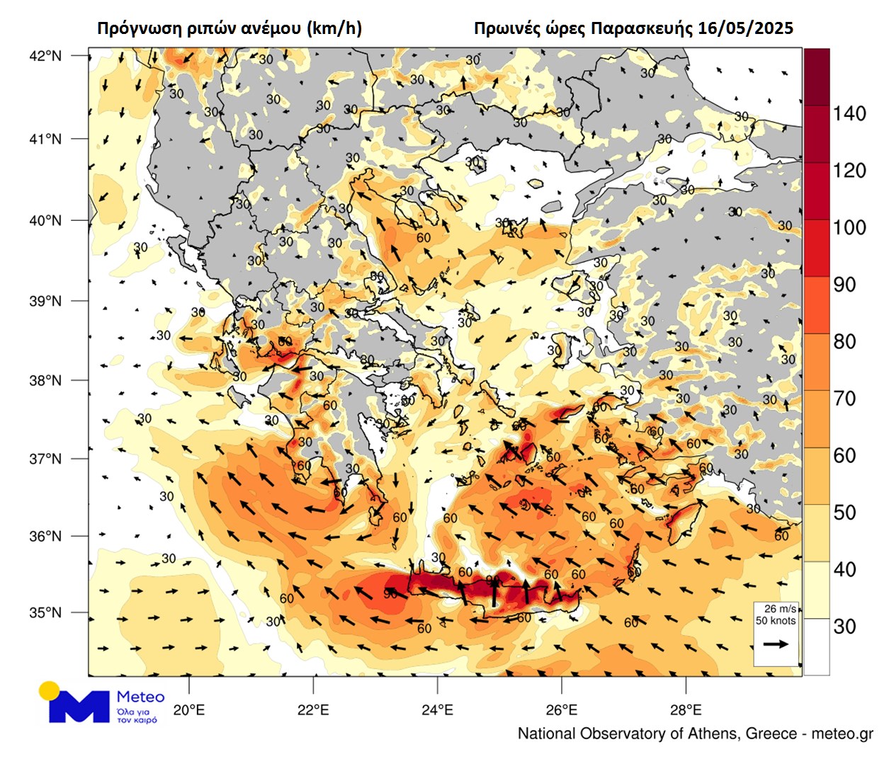 Παράλληλα, πνέουν θυελλώδεις νότιοι άνεμοι που φτάνουν κατά τόπους μέχρι και τα 9 μποφώρ ενώ η πρόγνωση θερμοκρασίας είναι η υψηλότερη στην Ελλάδα, φτάνοντας τις μεσημεριανές ώρες τους 33 βαθμούς κελσίου.