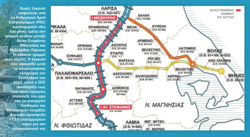 Στις αρχές του περασμένου καλοκαιριού, πάρθηκε μια απόφαση που πέρασε σχεδόν απαρατήρητη, όπως συνέβαινε με πολλές αποφάσεις πριν από το τραγικό δυστύχημα των Τεμπών. Η Ρυθμιστική Αρχή Σιδηροδρόμων (ΡΑΣ) απέρριψε την αίτηση του ΟΣΕ για επικαιροποίηση της Εγκρισης Ασφάλειας που διαθέτει ως Διαχειριστής Υποδομής στα τμήματα που είχαν κλείσει για την κυκλοφορία, μεταξύ των οποίων τον κλάδο ανόδου «Αγιος Στέφανος-Δομοκός-Παλαιοφάρσαλος-Μεζούρλο», δηλαδή ένα τμήμα γραμμής συνολικού μήκους 100 χιλιομέτρων.