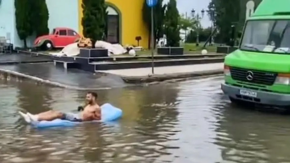 Νεαρός άνδρας βγήκε… με φουσκωτό και κοκτέιλ σε πλημμυρισμένο δρόμο | Video