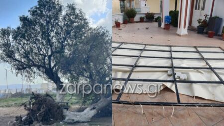 Χανιά | Ζημιές από τους θυελλώδεις ανέμους στην Κίσσαμο: Ταμπέλα καταστήματος έπεσε σε οροφή εκκλησίας – Δέντρο ξεριζώθηκε | Photos