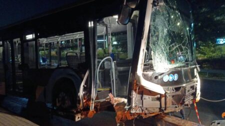 «Ακυβέρνητο» λεωφορείο διήνυσε 150 μέτρα – Ξήλωσε κολώνες και πινακίδες, έπεσε σε περίφραξη κτιρίου | Video