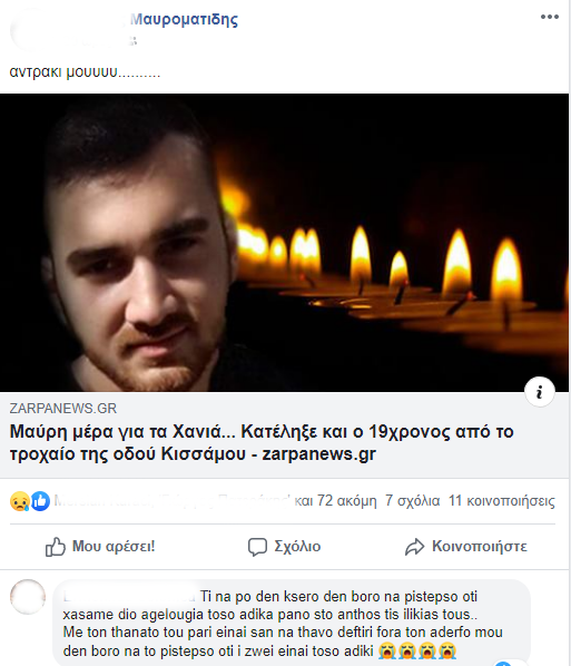 Έτσι, ξαφνικά, άλλη μία οικογένεια στα Χανιά ντύνεται στα μαύρα και ένα παιδί που είχε όλη τη ζωή μπροστά του δεν θα έχει την ευκαιρία να τη ζήσει…