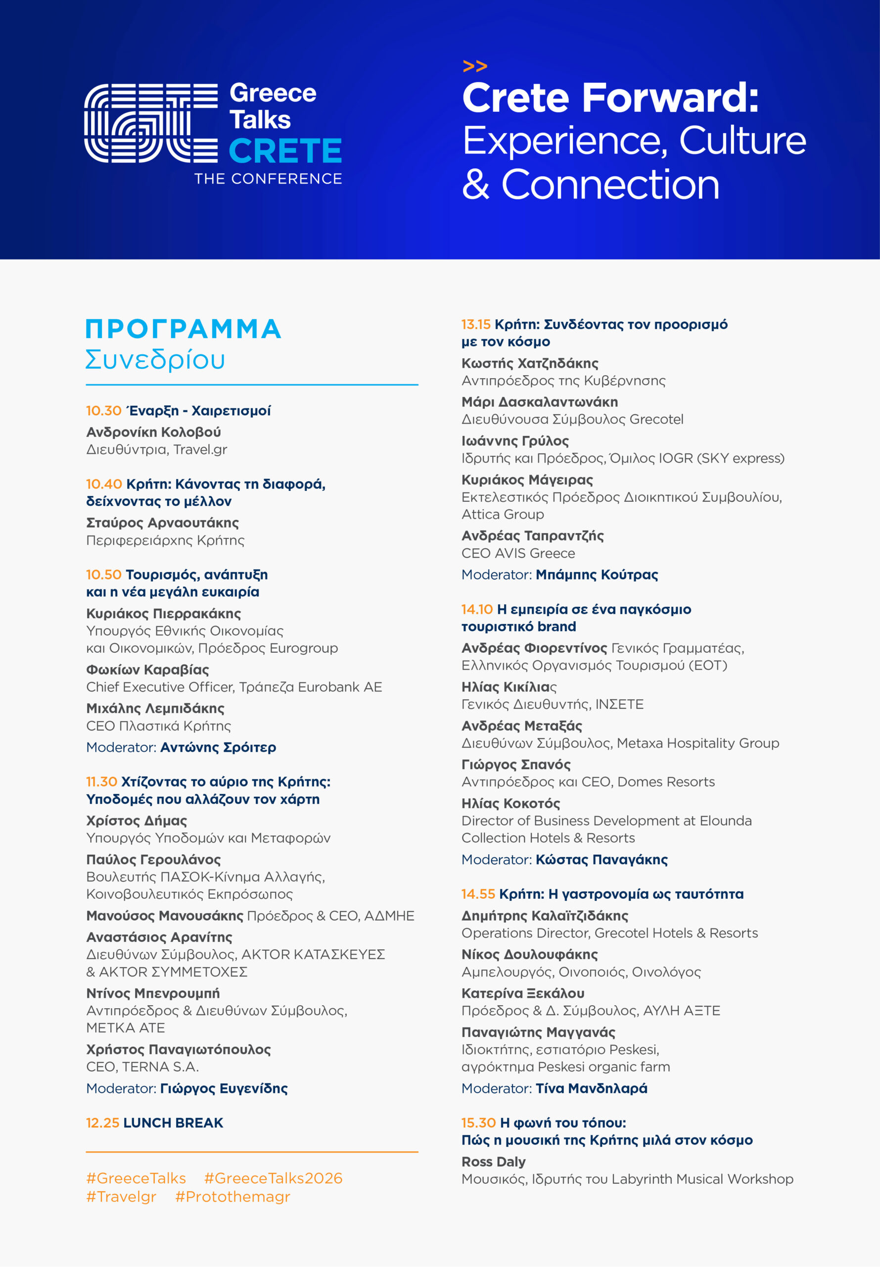 Η Κρήτη βρίσκεται στο επίκεντρο του δημόσιου διαλόγου μέσα απο το συνέδριο GREECE TALKS CRETE, που θα πραγματοποιηθεί στο Ηράκλειο την Παρασκευή 13 Μαρτίου, στο ξενοδοχείο Grecotel Amirandes (αίθουσα Amirandes Ballroom).