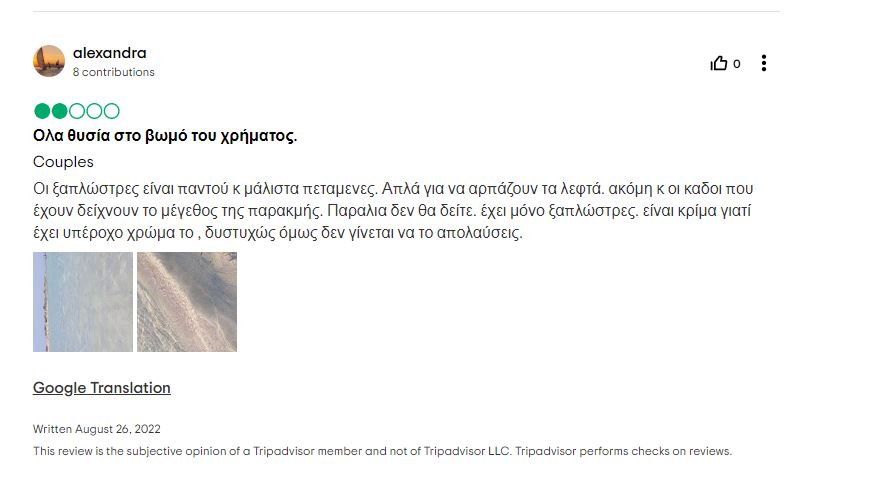 Όσον αφορά το Ελαφονήσι, παρότι η βαθμολογία του παραμένει υψηλή (4,5/ 5) τα τελευταία σχόλια που προστίθενται από επισκέπτες είναι ιδιαίτερα αρνητικά και αποτυπώνουν απογοήτευση και δυσαρέσκεια από την εμπειρία της επίσκεψής τους στην περιοχή.