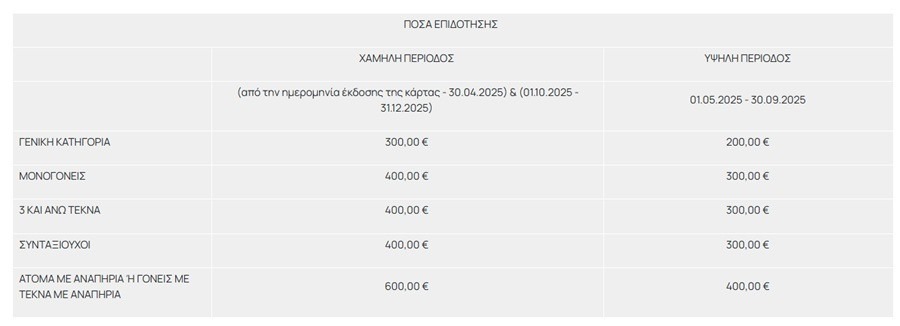 Περίοδος χαμηλής τουριστικής ζήτησης (από την έκδοση της κάρτας έως 30 Απριλίου 2025 και 1 Οκτωβρίου 2025 έως 31 Δεκεμβρίου 2025)