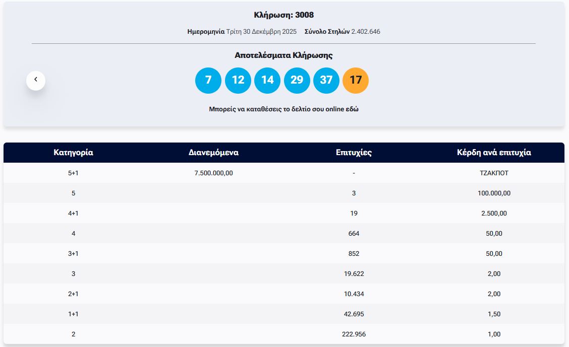 Οι τυχεροί αριθμοί είναι 7, 12, 14, 29, 37 και Τζόκερ το 17.
