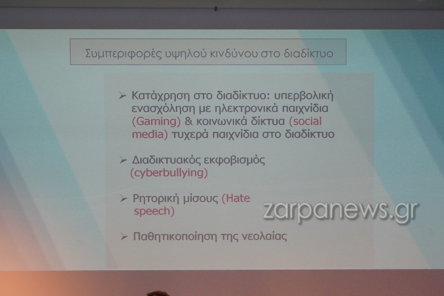 Τα βασικά προβλήματα που μπορούν να αντιμετωπίσουν τα παιδιά από τη χρήση του διαδικτύου και θα τα οδηγήσουν σε περιστατικά βίας, προκαλώντας αρνητικά αποτελέσματα, συζητήθηκαν στα πλαίσια ημερίδας που διοργάνωσε το 1ο Πειραματικό Γυμνάσιο Χανίων με θέμα «Οι Κίνδυνοι του Διαδικτύου»