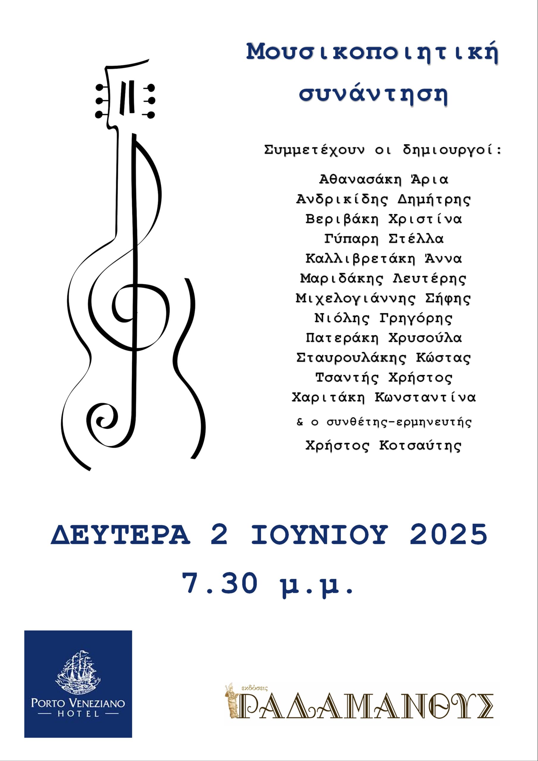 Τη Δευτέρα 2 Ιουνίου 2025, στις 7.30 το απόγευμα, ξεκινούν οι εκδηλώσεις των Εκδόσεων Ραδάμανθυς στη φιλόξενη αυλή του ξενοδοχείου Porto Veneziano, στο Ενετικό Λιμάνι των Χανίων. Η πρώτη αυτή εκδήλωση είναι ένα μουσικοποιητικό συναπάντημα, με απαγγελίες ποιημάτων και μουσική από τον συνθέτη και ερμηνευτή Χρήστο Κοτσαύτη.