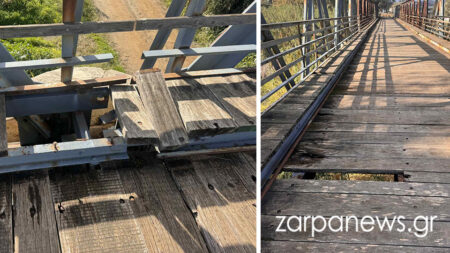 Με μια επίσκεψη στο σημείο διαπιστώσαμε του λόγου το αληθές: Η μεταλλική γέφυρα παραμένει… βομβαρδισμένη, με ξηλωμένα μεταλλικά και ξύλινα μέρη ενώ είναι δεδομένο ότι υπάρχει και πρόβλημα στατικότητας.